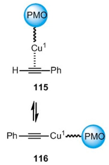 A plausible mechanism of the action of Cu/PMO nanocomposites on the alkyne-organoazide cycloaddition contemplates the formation of a copper π-complex 115 or a copper acetylide 116 as intermediate (Figure 8).