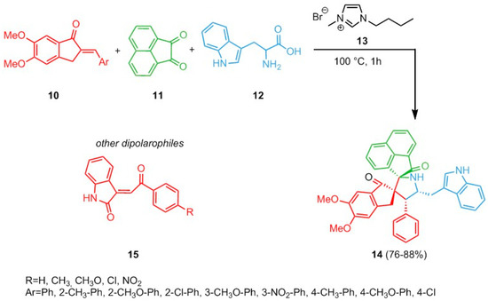 A series of spirooxindolepyrrolidines 14 as potential inhibitors of cholinesterase were synthesized by Kumar et al., using a 1,3-dipolar cycloaddition between azomethine ylide dipole, formed with various 1,2-diketones (11 or 15) and triptophan 12, and arylmethylidene inden-1-ones 10 as dipolarophile in ionic liquid media (Scheme 2) [28].