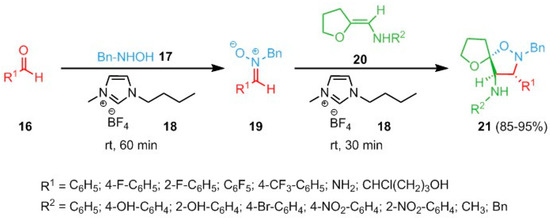 The reactions were conducted both in conventional solvent and in ionic liquid, noticing in the latter case a very good increase of yield up to 91%, a remarkable reduction of reaction time from hours to minutes and a superior stereoselectivity in isoxazolidine formation. In fact, the cycloadditions were oriented towards a mixture of endo and exo-isomers, favoring the endo-diastereomers. The authors carried out a screening of various bmim-based-ILs with varying anions (X = PF6−, Br−, BF4−), electing [bmim]BF4 as the best solvent. Moreover, they performed the reactions under neat conditions, without [bmim]BF4, also demonstrating catalytic activity of IL. Finally, the [bmim]BF4 was recuperated by washing with diethyl ether, drying at 80 °C under reduced pressure, and reusing up to five times without loss of activity nor selectivity.