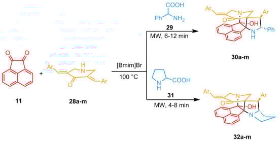 The reaction provided for the use of substituted bis-dipolarophiles 28a–m as starting materials that were reacted with azomethine ylides generated in situ from acenaphthenequinone 11 and α-amino acids, such as phenylglicine 29 and proline 31. The proposed cascade process produced a set of piperidone derivatives 30a–m and 32a–m with cage-like cavities, important for biological applications, in high yields and very short reaction time. The authors specified the catalytic role of ionic liquid that is involved at several steps, among which the initial azomethine ylide form (Scheme 7).