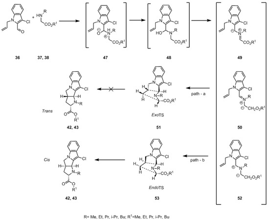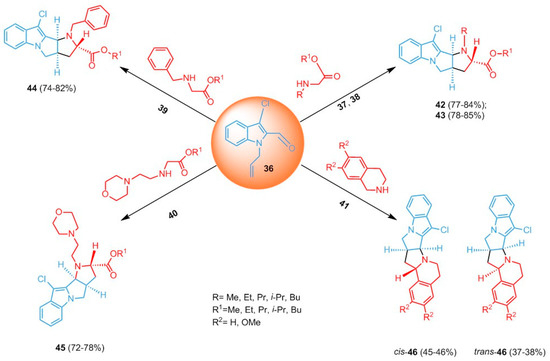 In the same year, Parmar et al. generated a new class of bioactive heterocycles 42–46 with N-fused indoles and N-fused isoquinolines inserted into a molecular assembly by 1,3-dipolar cycloaddtion reaction between the N-allyl-C-aldoderivatives of 3-chloroindole 36 and various amines 39–41, using trietylammonium acetate (TEAA) as inexpensive ionic liquid (Scheme 8) [41].