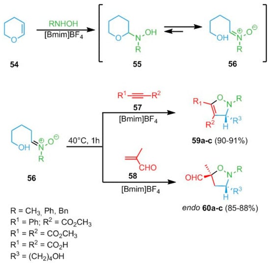 A versatile synthesis of isoxazolines 59a–c and isoxazolidines 60a–c was proposed from Chakraborty and co-workers in alternative to the classical methodology (CH2Cl2, as solvent, 40–60 °C, 42 h), to prepare cycloadducts deriving by 1,3-dipolar cycloaddition between dihydropyran derived nitrones 56 and alkynes 57 or alkenes 58 in ionic liquids (Scheme 10) [42].