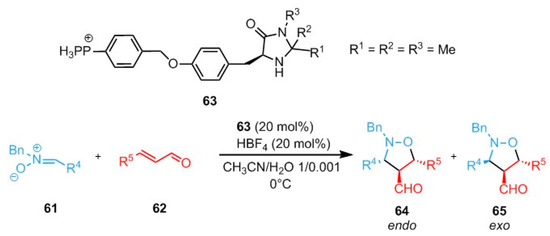 In 2014, an enantioselective version of synthesis of isoxazolidines 64 and 65 was proposed from Nie et al., employing tetraarylphosphonium supported chiral imidazolidinones 63 as catalyst in 1,3-dipolar cycloadditions of α,β-unsaturated aldehydes with nitrones (Scheme 11) [43].