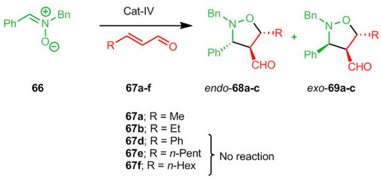 1,3-dipolar cycloaddition of (Z)-N-benzylidene-1-phenylmethanamine oxide 66 with α,β-unsaturated aldehydes 67a–f in presence of organocatalysts IV and ILs I-VI [45].