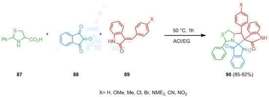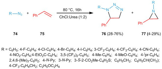 In 2018, Sebest and co-workers developed a synthetic procedure to form 1,2,3-triazolines 76 by direct 1,3-dipolar azide-alkene cycloaddition reaction in a series of DESs (Scheme 14) [59].