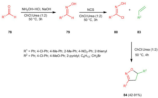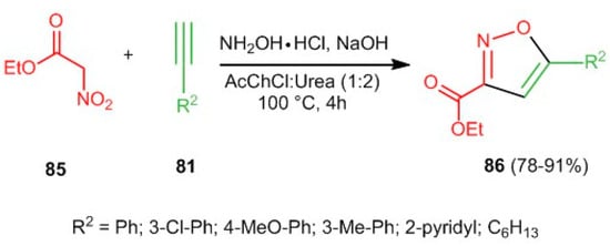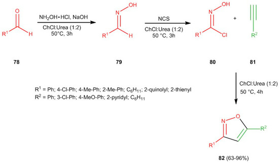 The optimization of the process was conducted prevalently varying the DES, electing the mixture choline chloride/urea 1:2 as the system with the best performance. After the optimization of the reaction conditions, a series of isoxazoles 82 were synthesized in 63%–96% yield.