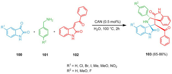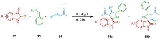 Spirooxindole derivatives have a privileged hetereocyclic core that confers them substantial biological activity, such as antimicrobial, anticancer, inhibitorial of MDM2-p53 interaction, and so on [24,25,26]. In 2015, an efficient, simple, and rapid one-pot synthesis of dispirooxindolo-pyrrolidines 8a–f and 9a–f via a three-component 1,3-dipolar cycloaddition in ionic liquid media was proposed from Arumugam et al. (Scheme 1) [27].
