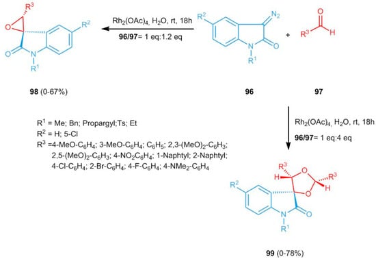 - Muthusamy, S.; Ramkumar, R. ‘On-water’ generation of carbonyl ylides from diazoamides: Rhodium(II) catalyzed synthesis of spiroindolo-oxiranes and -dioxolanes with an interesting diastereoselectivity. Tetrahedron 2015, 71, 6219–6226. [Google Scholar] [CrossRef]