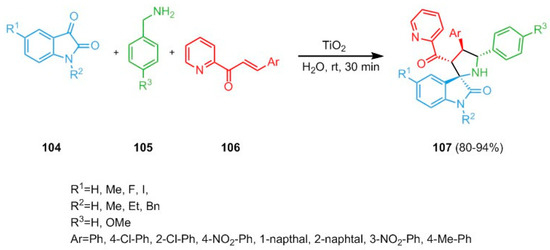 - Ramesh, P.; Reddy, M.S.; Kumar, N.S.; Rathod, B.; Prakasham, R.S.; Chowan, L.R. TiO2 Nanoparticle Catalyzed Rapid Synthesis of Spiroxindole-Pyrrolidine in Aqueous Medium and Evaluation of their Antimicrobial Properties. ChemistrySelect 2018, 3, 9096–9101. [Google Scholar] [CrossRef]