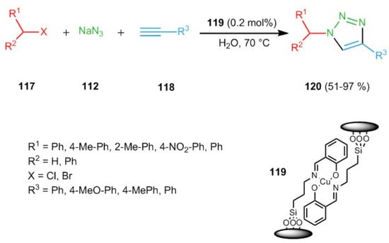 More recently, mesoporous SBA-15, a versatile mesoporous silica material, was functionalized with copper (II) acetate to afford a novel CuII-Schiff base/SBA-15 catalyst 119. It was employed in three-component CuAAC reactions to obtain 1,4-disubstituted-1,2,3-triazoles 120 from organic halides 117, sodium azide 112, and alkynes 118 in water in good to excellent yield (51%–97%) and good regioselectivity (Scheme 25) [75].