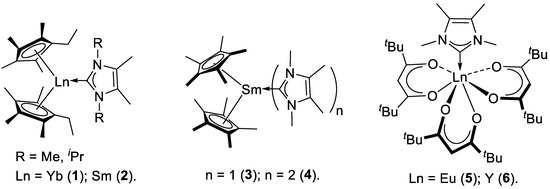 In 1994, Schumann et al. synthesized the first NHC-ligated Ln complexes (C5Me4Et)2Ln(NHC) (Ln = Yb (1), Sm (2)) by reacting (C5Me4Et)2Ln(THF) with an in situ-generated NHC (Figure 1) [37,38]. Subsequently, Arduengo et al. reported the syntheses and molecular structures of the carbene-Sm(II) complex (C5Me5)2Sm(NHC) (3) and its bis(carbene) adduct (C5Me5)2Sm(NHC)2 (4), and also the mono-carbene Eu (5) and Y (6) complexes bearing acetylacetonate ligands (Figure 1) [39]. Owing to its strong nucleophilicity, substitution of a weakly coordinated ligand by NHC remains one of the most common methods for preparing Ln–NHC complexes [40,41].