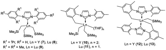 Reactions of Ln(CH2SiMe3)3(THF)2 (Ln = Y, Lu) with an in situ-generated bulky NHC, 1,3-bis(2,6-diisopropylphenyl)imidazol-2-ylidene (IPr), afforded the corresponding four coordinated (IPr)Ln complexes (IPr)Ln(CH2SiMe3)3 (Ln = Y (7), Lu(8)) (Figure 2) [42]. The treatment of 1,3-bis(2,4,6-trimethylphenyl)imidazol-2-ylidene (IMes) with Lu(CH2SiMe3)3(THF)2 yielded the expected (IMes)Lu(CH2SiMe3)3 complex (9). However, an attempted synthesis of an yttrium analogue with Y(CH2SiMe3)3(THF)2 led to the formation of a cyclometalated product [(IMes’)Y(CH2SiMe3)2(THF)2] (IMes’ = IMes deprotonated at the ortho-methyl group of the mesityl substituent) (10), presumably via σ-bond metathesis. Prolonged reaction of Lu(CH2SiMe3)3(THF)2 with IMes also afforded the corresponding Lu cyclometalated product 11 [42,43]. Not surprisingly, the reactions of Ln(CH2SiMe3)3(THF)2 (Ln = Y, Lu) with excess IMes gave rise to the bis-cyclometalated complexes [(IMes’)2Ln(CH2SiMe3)] (Ln = Y (12), Lu (13)) [43].