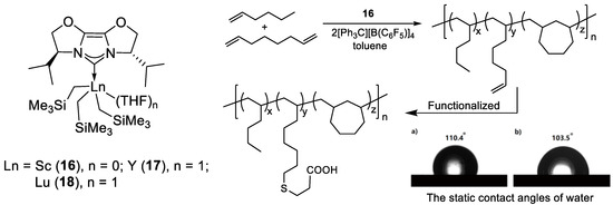 Inspired by the successful employment of monodentate NHC ligands in the Ln-catalyzed polymerization reaction, Pan et al. prepared a series of bis(oxazoline)-derived N-heterocyclic carbene (IBiox)-supported Ln trialkyl complexes (IBiox)Ln(CH2SiMe3)3(THF)n (Ln = Sc (16), n = 0; Y (17), n = 1; Lu (18), n = 1) by the treatment of Ln(CH2SiMe3)3(THF)2 with one equivalent of the freshly prepared IBiox (Figure 4) [45]. A single crystal X-ray diffraction study revealed that the geometry around the metal center in 16 is pseudo tetrahedral, while those of 17 and 18 are distorted trigonal bipyramidal with a coordinated tetrahydrofuran (THF). Upon activation with two equivalents of [Ph3C][B(C6F5)4], 16 exhibited high activity for the polymerization of 1-hexene (up to 285 kg·molSc−1·h−1) with the resultant polymers dominated by vinylene end groups (ca. 95%). On the other hand, the analogous Y and Lu complexes were inactive for the polymerization. The copolymerization of 1-hexene with 1,7-octadiene could also be achieved by using the catalytic system of 16/[Ph3C][B(C6F5)4] to generate random poly(hexene-co-octadiene). Incomplete cyclization of 1,7-octadiene resulted in about 20% pendant vinyl groups in the copolymers. The hydrophilicity of the resulting copolymers could be enhanced by functionalizing the vinyl groups into the carboxylic acid groups via a thiol-ene reaction.