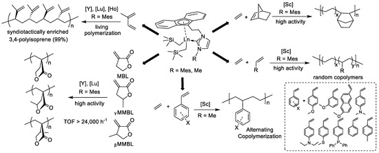 In addition to the coordination polymerization, the Y and Lu complexes (Flu-NHC)Ln(CH2SiMe3)2 (Ln = Y (44), Lu (45)) were also employed as the catalysts for rapid and stereoselective polymerization of renewable methylene methylbutyrolactones, such as α-methylene-γ-butyrolactone (MBL), γ-methyl-α-methylene-γ-butyrolactone (γMMBL), and β-methyl-α-methylene-γ-butyrolactone (βMMBL) (Figure 13) [71]. Both 44 and 45 were highly active for the polymerization of γMMBL at room temperature, achieving an exceptionally high turnover frequency (TOF) of 24,000 h−1, which was 2400 times higher than that of homoleptic Ln-trialkyls. Moreover, 44 and 45 were also found to be active in the homopolymerization of βMMBL and its copolymerization with γMMBL, which represents the first example of metal-catalyzed coordination polymerization of βMMBL. The homopolymer resulting from βMMBL displays high stereoregularity (91% mm) with a high Tg of 290 °C.
