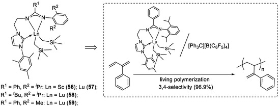 Admidinate-tethered NHCs (Amidino-NHC) were also employed by Cui et al. for the synthesis of amidino-NHC-supported Ln complexes (56–59) (Figure 14) [72]. Under the activation with [Ph3C][B(C6F5)4], the Lu complexes (57–59) exhibited high activities and 3,4-selectivities (96.9%) in the polymerization of 2-phenyl-1,3-butadiene in a living mode to afford new plastic polydienes with high glass transition temperatures (Tg = 44.3–56.1 °C). However, the analogous Sc complex 56 was inert under the same reaction conditions. The different catalytic performance of 56 and 57 on isoprene polymerization is similar to that of 43 and 45 with a fluorenyl-tethered NHC ligand, showing the importance of the type of central metal.
