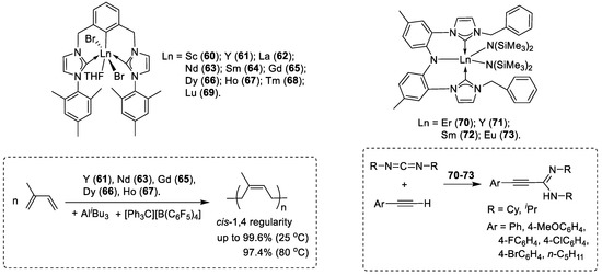 A series of CCC-pincer 2,6-xylenyl bis(carbene)-ligated Ln dibromides (60–69) were synthesized via the treatment of imidazolium dibromide proligands and LnCl3 with dropwise addition of nBuLi (Figure 15) [79,80]. The Y, Nd, Gd, Dy, and Ho complexes exhibited high activity and cis-1,4 selectivity (99.6%, 25 °C) in the polymerization of isoprene under activation with AlR3 (R = Me, Et, iBu) and [Ph3C][B(C6F5)4], while the others were inactive. Moreover, this system maintained a high cis-1,4 selectivity (97.4%) at 80 °C, indicating its tolerance to elevated temperature conditions. According to the analysis of in situ NMR spectra, the yttrium hydrido aluminate cation was speculated to be the active species.