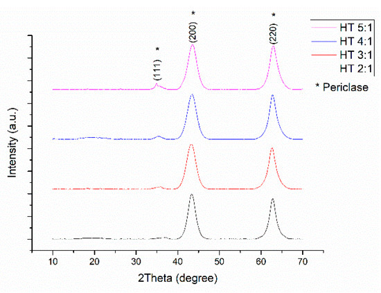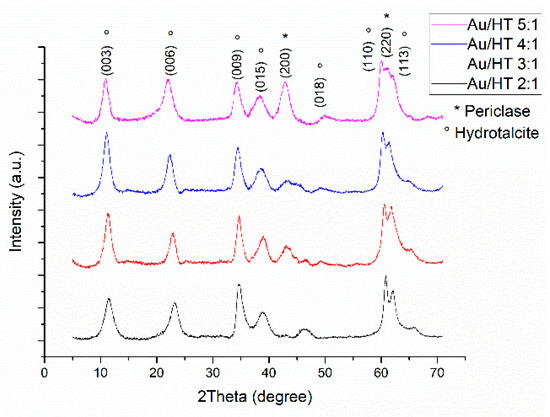 After gold nanoparticles immobilization, the prepared samples were characterized again using XRD technique (Figure 2). The XRD patterns presented typical diffraction peaks from hydrotalcite (powder diffraction file 89-460 from ICDD). Due to hydrotalcite memory effect, it was able to recover its original structure upon rehydration of the mixed oxides when subjected to the gold nanoparticles immobilization protocol. However, it is still possible to observe the presence of periclase, by the appearance of the peaks at 2θ ≈ 43° and 63°, which is more remarkable for the samples with higher Mg/Al ratio.