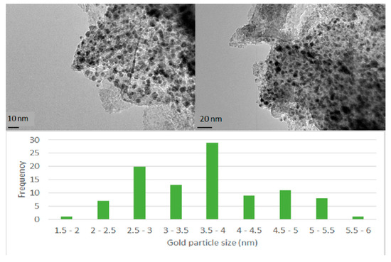 The Au/HT 4:1 catalyst was selected for characterization by TEM to determine the metal dispersion on the surface due to its performance (see below). TEM images and particle size distribution can be seen in Figure 3. The images showed that the gold nanoparticles are highly dispersed on the support surface. The particles sizes are distributed between 2.5 and 5.5 nm with an average particle size of 3.7 nm.