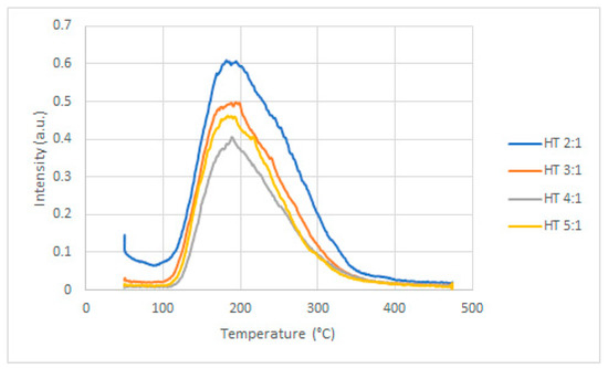 Finally, to characterize the acid-base properties of the supports, TPD experiments were performed using either 10 mol.% NH3 or CO2 in He gas mixtures. The adsorption of the gas molecules were carried out at 50 °C and 40 °C, respectively, for 1 h. For desorption, the temperature ramp used was 10 °C min−1 up to 500 °C, which is the calcination temperature used to prepare hydrotalcite supports [18]. The desorption curves of NH3 for the different supports are shown in Figure 4.