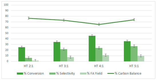 Comparison of the performance in furfural oxidation of HT supports with different molar Mg: Al ratios. Batch reactor, p = 6 bar (O2), t = 110 °C, 2 h, stirring rate 600 rpm, [FF] = 26 mM, 100 mg of HT.