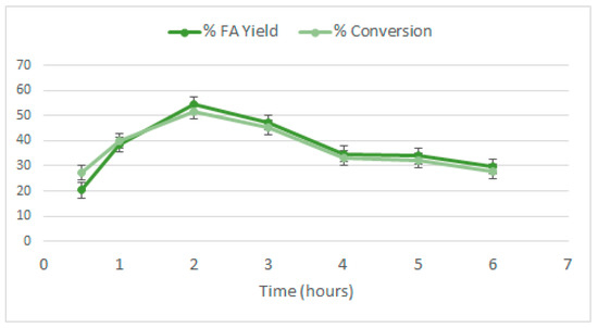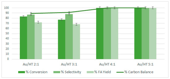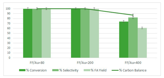 Au/HT 4:1 was tested using three different theoretical molar ratios between furfural and gold: 80, 200 and 400. As can be seen in Figure 9, the catalyst showed full conversion and high furoic acid yield at low FF/Au molar ratios.