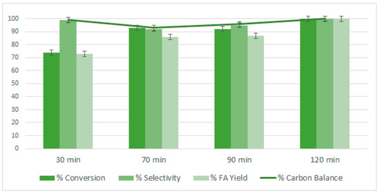 The effect of the reaction time on catalytic activity was further studied using the Au/HT 4:1 catalyst. Complete furfural conversion was observed after 120 min of reaction as shown in Figure 7. The selectivity to furoic acid was above 90% in all cases. In addition, the carbon balance was above 90%, indicating minimum degradation of furfural in these conditions. It shows that the catalyst is very active even at short reaction times.