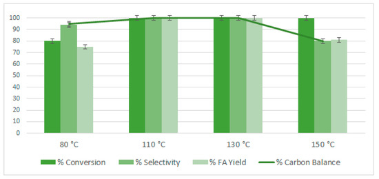 The reaction was also studied regarding the influence of the temperature. The results are presented in Figure 8. At an FF/Au molar ratio of 80, the catalyst displayed full conversion, both at 110 and 130 °C, with high values of selectivity and carbon balance. However, at higher temperature (150 °C) some degradation of furfural occurred as illustrated by the lower carbon balance values. At 80 °C the conversion was not complete after 2 h of reaction.