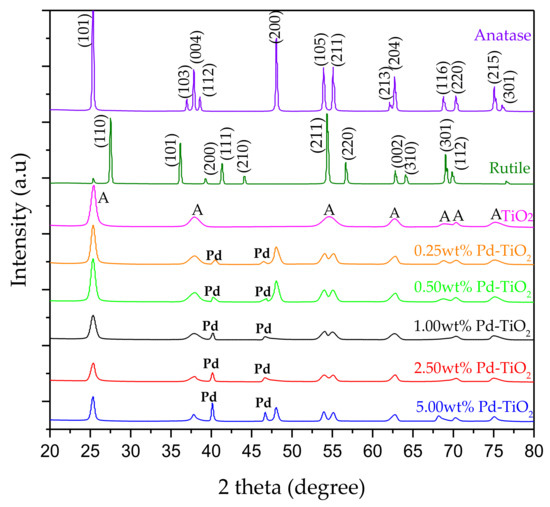 X-ray Diffractograms for Pd-Doped TiO2 Photocatalysts. XRDs for A = anatase and Pd = palladium are shown as a reference.