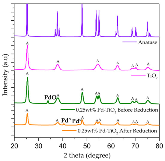 Comparative Analysis of 0.25 wt% Pd-TiO2 Photocatalysts Before and After Reduction. A = anatase, PdO = palladium oxide and Pd° = metallic palladium.