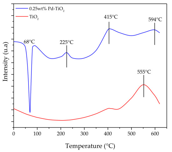 Furthermore, as reported in Figure 3, the 0.25 wt%Pd-TiO2 semiconductor showed double peaks in the 400–600 °C range, which were attributed to the Ti+4 ions surface reduction [42]. Similar trends to the ones reported in Figure 3 were found for all doped photocatalysts, with these consisting of 0.25 wt% to 5.00 wt% Pd-TiO2. It should be noted, however, that only the second peak in the 200–300 °C range was considered in all the calculations, in order to establish the amount of reducible palladium.