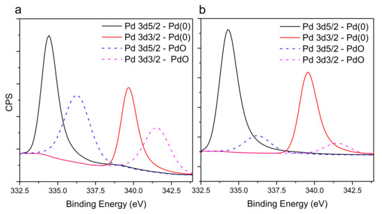 Figure 2 reports a comparative analysis of the XRD diffractograms for the photocatalysts before and after reduction. One can see a peak at 34° of the 2θ angle scale, which corresponds to (002) reflections of a tetragonal palladium oxide phase [JCPDS 41-1107]. Furthermore, the peaks at 40° and 46° of the 2θ angle scale relate to the Pd° [JCPDS No. 87-0638]. Thus, there is a structural difference in the semiconductor material after the reduction process, with the absence of XRD detectable palladium oxides and the formation of metallic palladium h k l (1 1 1) and (2 0 0).