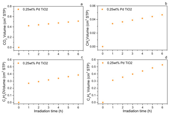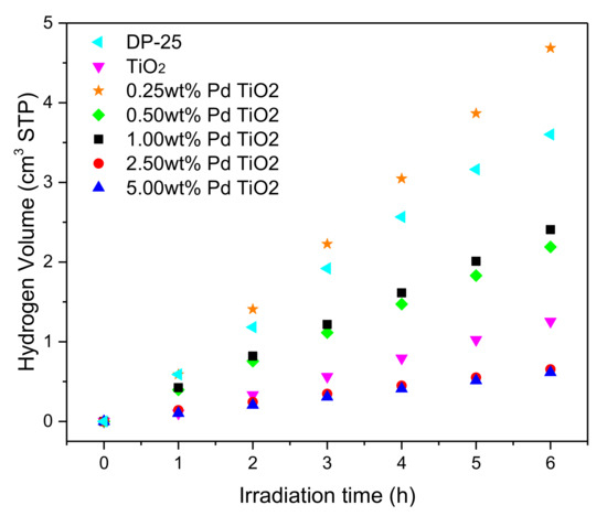 Figure 7 reports the cumulative hydrogen volume produced, using TiO2 doped with different Pd loadings under visible light. It was shown that Pd-TiO2 semiconductors consistently enhance hydrogen production, with the best performance obtained with the 0.25 wt% Pd. This mesoporous semiconductor may have an increased scavenging effect of photogenerated electrons and therefore, prevent electron–hole pairs recombination [53].