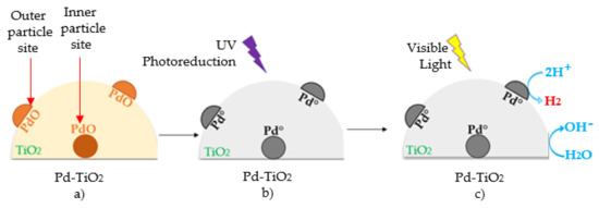 Schematic Representation of: (a) The synthesized photocatalysts following calcination at 500 °C with most of the Pd being present as PdO, (b) The photoreduction of the PdO to Pd° using a UV-Lamp for 1 h, (c) The H2 production using a photoreduced Pd-TiO2, with molecular H2 being generated on the semiconductor.