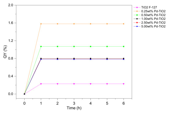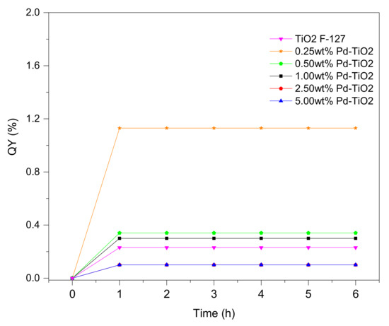 Table 7 and Figure 11 report the QY% for the mesoporous photocatalysts doped with palladium at different metal loadings (0.25, 0.50, 1.00, 2.50, and 5.00 wt%) under the following conditions: (a) Photocatalyst slurry concentrations of 0.15 g/L, (b) 2.0 v/v% ethanol, (c) pH = 4 ± 0.05 and (d) Visible light.
