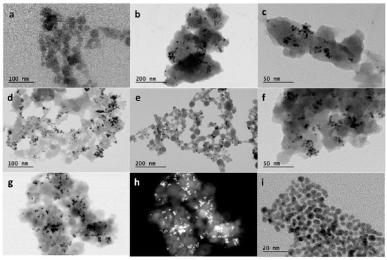Transmission electron microscopy (TEM) images of (a) bare SiTi; (b) Au@SiTi; (c) Pd@SiTi; (d) Au4Pd1@SiTi; (e) Au1Pd1@SiTi; (f) Au1Pd4@SiTi; (g) Au1Pd1@SiTi; (h) Au1Pd1@SiTi in dark field measurement and (i) preformed Au1Pd1 nanoparticles stabilized by sodium citrate and used for the embedded catalysts synthesis.