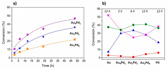 In these reactions, the highest activity was observed for Au4Pd1 compositions (Section 2.1, Figure 2b), which is in good agreement with the previous data. Indeed, the arrangement between gold and palladium atoms plays a crucial role in catalytic performances of the bimetallic catalytic systems [26,27]. Therefore, the optimization and control of the fine bimetallic nanoparticles structure constitute the major objective to obtain high catalytic performances (the so-called “catalysis by design”), which finally allows the design of the most effective catalytic materials. The synthesis protocol used for bimetallic nanoparticle preparation strongly affects the type of the catalyst morphology. The interaction between two metals strongly influences the catalytic performance, as already reported [28,29,30]. The optimal metal-to-metal ratio must be determined for a given reaction. In the case of bimetallic catalysts based on AuPd systems, the remarkable increase in the catalytic oxidation activity was already observed [31,32,33,34,35,36]. In liquid phase oxidation of aldehydes and alcohols, the AuPd nanoparticles have already proved to be twice as efficient as the Au or Pd alone. It has been proposed that Au plays the role of an electronic promoter of Pd [35,36], which is in good agreement with the observed core-shell structure. A compositional effect has also been reported, where a gradual increase in catalytic activity was observed with the increase in Pd content. An optimal Au–Pd molar ratio of about 1:1.86 was reported for gas phase CO oxidation [37]. In our case, the catalytic activity also passes through the maximum for Au4Pd1 composition. This is also in good agreement with the literature for liquid phase oxidation of glucose and benzyl alcohol [20,25]. It could be stated that an optimum ratio between Pd0 and Pd2+ species is necessary to maintain the high activity of these catalysts, as well to obtain high selectivity to desired products [20,38].