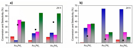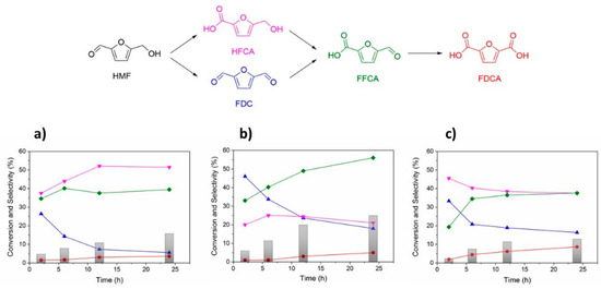 The results of HMF oxidation are presented in Figure 4 and Figure 5, and, as expected, all the catalysts were active. Variation in the AuPd composition affected both conversions and selectivities, with better catalysts being obtained when the Au proportion was increased in the bimetallic systems (Figure 4a). A volcano profile was observed when plotting the conversion observed after 24 h as a function of the catalysts’ composition (Figure 4b), where a maximum activity was reached for the Au4Pd1 gold-rich composition. The distribution of the products was also greatly affected by the composition variation (Figure 5). Pure Au favors the formation and accumulation of 5-hydroxymethyl-2-furancarboxylic acid (HFCA), as already observed in a previous study focused on Au catalysts in different supports [18]. The addition of Pd makes possible the formation of 2,5-diformylfuran (FDC) by the chemisorption of HMF via the aldehyde group [19], which was detected in all AuPd (Figure 5b) and pure Pd compositions (Figure 5c). In the Au-rich Au4Pd1 composition, the formed FDC was quickly consumed, leading to higher yields of furandicarboxylic acid (FDCA) (Figure 5).