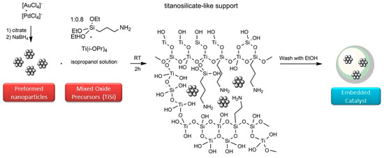 In 200 mL of water with vigorous stirring, Au and Pd precursors (HAuCl4 solution 30 wt.% and PdCl2, 10.11 × 10−5 mol of metal) and 2 mL of a sodium citrate solution (0.17 M, metal:citrate = 1:3.4) were added. Then, a freshly prepared solution of NaBH4 (50 mM, 10 mL, NaBH4/Au (mol/mol) = 5) was then added drop by drop to form a metallic sol; the color of the sol was dark brown (Au1Pd1, Au1Pd4) and light-red (Au, Au4Pd1). After 20 min of sol generation, 400 mL of water were added. Then, 10 mL of a solution containing titanium isopropoxide (TIP) and (3-aminopropyl)triethoxysilane (APTES) (Si:Ti (mol/mol) = 3:2) were filtered using a 0.22 µm filter membrane and slowly added. After the hydrolysis of the oxide precursors (2 h), the slurry was filtered, the solid washed with ethanol (2 × 25 mL) and dried at room temperature (RT) for 24 h.