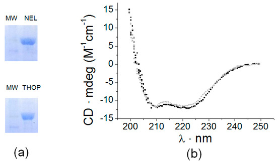 Purification of recombinant oligopeptidases THOP (EC 3.4.24.15) and NEL (EC 3.4.24.16). (a) Twelve percent SDS-Page of purified recombinant THOP and NEL followed by Coomassie Blue staining, indicating the purification homogeneity. (b) Circular dichroism profile of rTHOP and rNEL, demonstrating a proper fold after purification. All samples were prepared, and the spectra obtained, as described in Materials and Methods.
