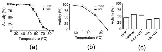The thermostability of THOP and NEL were assessed by previous incubation in defined temperature in buffered aqueous solutions (not immobilized) and immobilized in a 1% agarose matrix. Activity assays were performed by measurement at 37 °C on the fluorogenic substrate Abz-GFSPFRQ-EDDnp after each step of enzyme challenging to a temperature ramp of 5 °C per 20 min (Figure 2). Figure 2a shows that in solution, rTHOP and rNEL have the turning point (half-activity) of temperature-induced denaturation and loss of activity at 60 °C. When immobilized in a 1% agarose matrix, the half-activities of THOP and NEL increased to 75 °C (Figure 2b). A plausible explanation for the gain of thermal stability in an agarose matrix, at least in the case of THOP, is a probable impairment of inactivating enzyme oligomerization that is observed after a few hours of incubation in solution. Considering that oligomerization involves the formation of intermolecular disulfide [50,51], the reducing agent DTT was also used as control. It also used the THOP cysteine mutant 6 M, where all six surface-exposed cysteine residues were mutated to serine (Figure 2c). DTT preincubation and THOP mutations promoted a small increase of rTHOP and rNEL thermal resistance. This result can be rationalized considering that the oligomerization promoted by heating is preceded by unfolding, which exposes internal cysteine residues and results in an intermolecular reaction. The better thermal resistance obtained for the peptidases in the agarose matrix demonstrates the importance of immobilization for the gain of stability. The aspects of THOP and NEL stability regulation by reducing agents are already well discussed in the literature, and they were the result of a combined effect of mixed forms of inactive oligomerized enzymes and oxidation as post-translational modification [47,50].