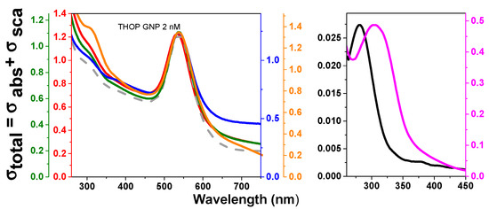 UV-vis spectra of rTHOP-gold nanoparticles (GNPs) synthesized with different THOP concentrations. Spectra of THOP-GNPs were obtained from synthesis using 200, 40, 8 and 2 nM of recombinant THOP. These values correspond to 1200, 240, 48 and 12 nM of exposed sulfhydryls. Red: THOP-GNP 2 nM. Green: THOP-GNP 8 nM. Blue: THOP-GNP 40 nM. Orange: THOP-GNP, 200 nM. Gray dashed line: GNP-HEPES (without protein). Black: THOP protein. Pink: reaction without HEPES. The wavelength of 300 nm corresponds mainly to Au-protein complexes absorption and 535 nm to the surface plasmonic resonance (SPR) band of the nanoparticle. The samples were prepared, and the spectra obtained as described in Materials and Methods.