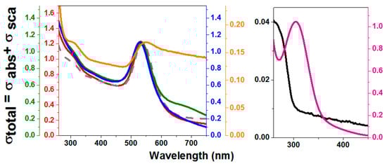 This spectroscopy was used to quantify proteins and characterize nanoparticles. UV-vis also characterized the optical properties of metallic nanoparticles, including absorbed radiation (σabs) and scattered radiation (σsca), where σtotal = σabs + σsca. Samples were analyzed in quartz cuvettes with optical path 1.0 or 0.5 cm. A UV-visible Photodiode Array Spectrophotometer MultiSpec-1501 spectrophotometer (Shimadzu Co, Kyoto, Japan) was used. The synthesis temperature of the GNPs was controlled by a thermal bath coupled to the spectrophotometer.