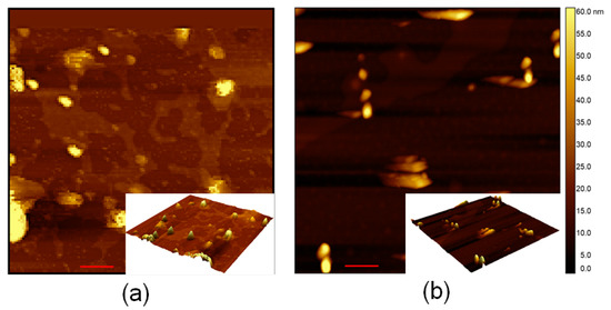 The position of SPR bands of GNPs between 525 and 535 nm that was obtained for all THOP- and NEL-GNPs synthesized it was possible an estimative of the GNP diameter between 20 and 60 nm based in literature data [52]. The stoichiometry protein/nanoparticles can also be calculated. Considering the mean diameter of 40 nm, in atomic spherical metal clusters [53,54], the concentration of protein-GNPs obtained in our synthesis is 1 nM, resulting in a THOP/NEL:GNP ratio of 2:1 rTHOP and rNEL GNPs synthesized in the presence of 2 nmol.L−1 of the proteins. The spherical shape of rTHOP and rNEL GNPs with a mean diameter of 40 nm was corroborated by atomic force microscopy (AFM) measurements (Figure 5a,b). Figure 5a depicts a 2D representation of rTHOP-GNP, while Figure 5a, inset, depicts a 3D representation of the same bio-functionalized nanoparticle, indicating monodispersed GNPs and suggesting spherical shapes of the particles. Similarly, Figure 5b, inset, represent rNEL-GNP in 2D and 3D perspectives, respectively.