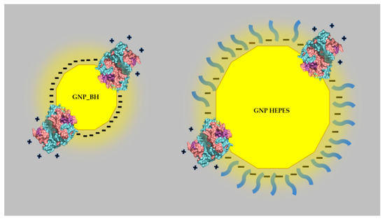 All syntheses were performed in a laminar flow cabinet using small lab glass vials clear with a black screw cap. The glassware for synthesis was previously cleaned to avoid undesired nucleation aggregation of colloidal gold solutions [56]. The addition of reagents was performed as follows: Milli-Q deionized water, 0.2 mM sodium phosphate buffer plus HEPES, pH 9.0, 100 μL of protein solution per mL and tetrachloroauric acid solution (400 μM). GNPs were synthesized at 40 °C for 2 h on a vat dry bath and let stabilize at room temperature. After 24 h of synthesis, the GNP colloidal suspensions were centrifuged and resuspended in 0.2 mM sodium phosphate buffer plus HEPES, pH 7.0 and stored at 4 °C. Several syntheses were performed and characterized by UV-vis to guarantee reproducibility. GNPs synthesized with sodium borohydride (GNP-BH) were prepared by a reaction between sodium borohydride (2 mM) in water and tetrachloroauric acid solution (0.25 mM) at 0 °C and maintained under agitation (200 rpm) for 15 min [63,64]. This solution was maintained for 24 h at 4 °C, and enzymes were added and incubated for 4 h before UV-vis, dynamic light scattering (DLS) and Zeta potential measurements [65].