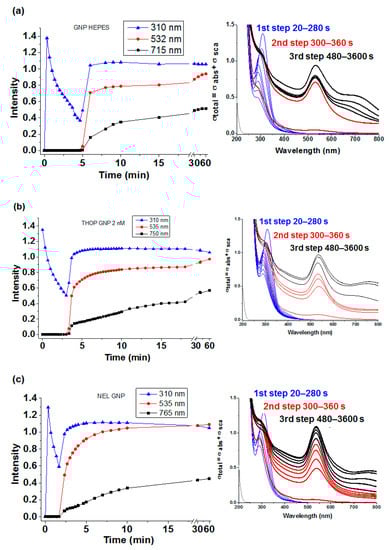 Considering the interest in the use of THOP- and NEL-GNPs as catalysts, it is essential to have effective enzyme immobilization and activity in the same conditions in which free enzymes are active. Therefore, the kinetics of HEPES-GNP synthesis assisted by the enzymes were compared with the kinetics of GNPs synthesized with HEPES alone. Figure 7a shows the kinetic of GNP synthesis by using 30 mM HEPES as a reducing and stabilizing agent in the absence of THOP and NEL that is compared with the respective synthesis kinetics of GNP formation assisted by 2 nmol.L−1 THOP and NEL (Figure 7b,c respectively). In all the conditions used, it was observed that the kinetics of GNP synthesis in the presence of HEPES had three essential observable steps: progressive spectral changes in the UV region that corresponded to the occurrence of gold ion reduction and formation of nanoclusters (step 1), SPR band formation (step 2) and the progressive increase of a broad band at the spectral range of 700–800 nm. Considering the three steps of synthesis that involves changes in the UV region, followed successively by increasing of SPR bands and a band around 750 nm, Figure 7a–c show the kinetics of synthesis monitored at 310 nm, 532–535 nm and around 750 nm and the insets with the corresponding spectra obtained in the course of the synthesis. The kinetics of GNP formation in the processes assisted by the enzymes was significantly different of that promoted by HEPES alone, especially at the steps of involving changes in the visible region. Considering the high concentration of HEPES relative to the enzymes, it was expected that the buffering agent is the principal agent for gold ion reduction and nanoclusters nucleation in step 1. After the formation of nanoclusters, the association with the enzymes at some nanoclusters facets drives the nanoparticles growing and consequently the kinetics of SPR and the 700–800 nm band increasing. It is important to note that for GNPs synthesized in the absence of enzymes the band in the red region of the spectrum that appeared in the third step peaks at 715 nm whereas in the synthesis assisted by the enzymes the peak was found at 765 nm. The nature of this band remains to be determined but it is suggestive of the formation of elongated nanostructures or aggregates.