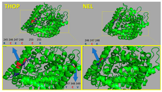 Comparative cartoon of Protein Databank (PDB) structure of THOP and NEL highlighting cysteine and basic amino acid residues of each enzyme. In THOP structure, there are three exposed acidic cysteine residues: C246, C248 and C253, whereas NEL has only one exposed acidic cysteine residue that is C247. In the cartoon structures, cysteines are highlighted in red while the neighbor basic amino acids R and K are highlighted in blue.