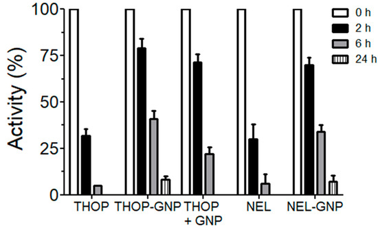 The temporal activity preservation of both free and immobilized proteases was compared. Free enzymes showed higher activity than the immobilized ones, but the stability of in solution rTHOP and rNEL at room temperature decreased until complete loss of activity in a few hours (Figure 10). However, gold nanoparticles-enzymes preparations of rTHOP-GNP and rNEL-GNP maintained their proteolytic activity even after 24 h (retaining 8.1% and 7.3% of their activity, respectively). We also tested the possibility that HEPES-based GNP (without protein) could also be capable of stabilizing THOP activity. As observed, it resulted in a retention of 22% of its activity at the time of 6 h, indicating the presence of in solution free GNPs are capable of stabilizing THOP activity. The extension of stability, however, was not comparable to GNP-immobilized THOP, still active after 24 h.