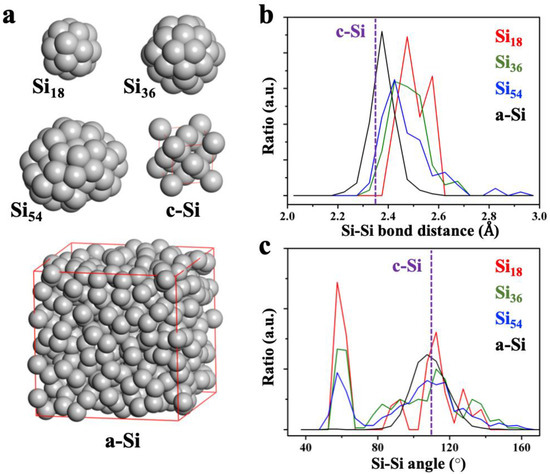 We produced three optimized pure Si nanoparticle (NP) structures with 18 (Si18), 36 (Si36), and 54 (Si54) Si atoms using the MC sampling method based on the ReaxFF potential (Figure 2a). The sizes of the Si NPs were approximately 0.7, 1.0, and 1.3 nm for Si18, Si36, and Si54, respectively, including the Shannon radii for Si atoms (0.04 nm) [24]. We found that the structures of Si NPs are highly symmetrized and that these Si–Si bonding networks are closer to the bulk amorphous Si structure (a-Si) than to the bulk crystalline Si structure (c-Si). As shown in Figure 2b,c, the bond and angle distributions of the nearest neighbor Si atoms clearly show the structural similarity between Si NPs and a-Si (the structure of a-Si in Figure 2a was obtained from other literature [25]). As the size of the Si NP increases from Si18 to Si54, the overall distances of Si–Si bonds are shortened, getting close to the distribution of the a-Si (the average Si–Si bond distances are 2.50, 2.48, 2.47, 2.38, and 2.35 Å for Si18, Si36, Si54, a-Si, and c-Si, respectively), by the decreased contribution of the surface Si atoms that have low coordination numbers (the Connolly surface [26] to atomic volume ratios are 0.69, 0.58, and 0.52 Å−1 for Si18, Si36, and Si54, respectively). For the same reason, the angle distributions around 60° (contributions from the surface Si atoms) are decreased as the size of the NPs increases. The rest of the angle distribution shows an almost similar shape to that of a-Si (average angles are 90.83, 95.99, 97.59, 109.02, and 109.47° for Si18, Si36, Si54, a-Si, and c-Si, respectively). Due to the nature of this Si bonding network, the lithiation behavior of Si NPs could be closer to a-Si than c-Si so that the faster Li diffusion is expected inside the Si NPs, as reported in previous theoretical studies [27,28,29] that are based on bulk a-Si structures. In this regard, we theoretically investigated the lithiation behavior in Si NP models with high surface ratios.
