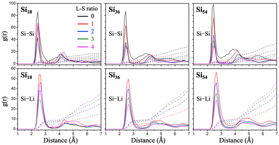 The radial distribution functions for Si–Si and Si–Li atomic pairs for each lithiated Si NP during the 300 K ab initio molecular dynamics (AIMD) simulations. The solid lines are the radial distribution function (RDF), and the dashed lines are the integral values.