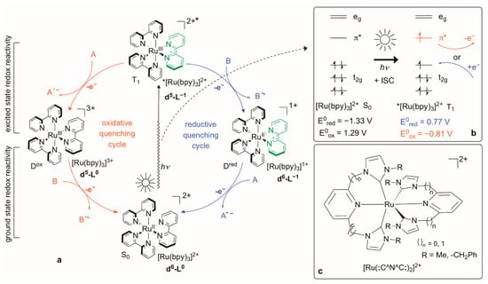 The development of advanced solutions and materials that enable the sustainable and eco-friendly use of resources in technologically key chemical and/or energy transformations has a high priority in the field of modern chemical science. Owing to the recent intensive efforts to design such solutions, visible-light photoredox catalysts based on transition metal complexes have emerged as promising materials. These species could facilitate valuable energy-demanding organic processes by transforming the energy of sunlight into chemical energy []. Amongst the most studied and best performing transition metal photoredox catalysts (TMPRCs) are the ruthenium–polypyridine and iridium–phenylpyridine (ppy) derivatives, for example, [Ru(bpy)3]2+ (Figure 1a) and Ir(ppy)3, respectively [,,]. In attempts to leverage the abundant and freely available solar energy, new developments in the design and application of these classical TMPRCs have come to light, for example, the so-called cooperative catalysis, where a photoredox catalytic system is used in synergy with another TM catalyst to facilitate chemical transformations [,,]. Other widespread applications of the parent TMPRC platforms and other closely related iridium and ruthenium derivatives include photovoltaic-like dye-sensitized solar cells (DSSCs) [,], chemical sensing [,], photodynamic therapy [,], etc. All these applications arise from the capability of these transition metal complexes to undertake light-driven charge separation through metal-to-ligand charge transfer (MLCT) processes [,].